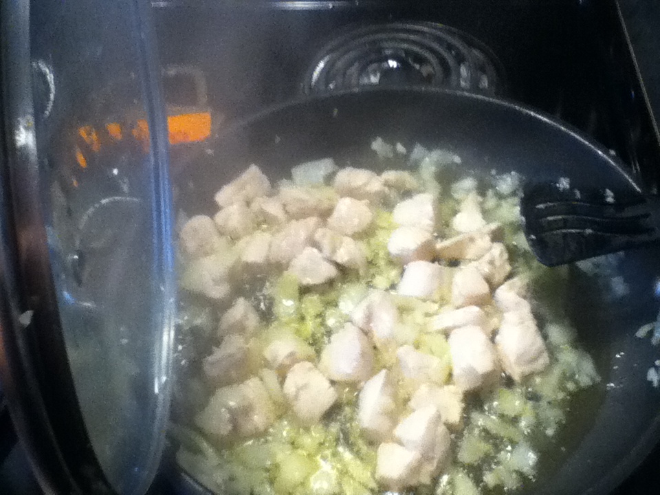 Step 2: I let the chicken brown in olive oil with the onions and garlic adding some Italian seasoning. Covering to cook.